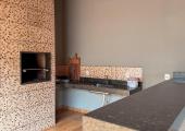 -Varanda com bancada em granito, fogão a lenha e churrasqueira